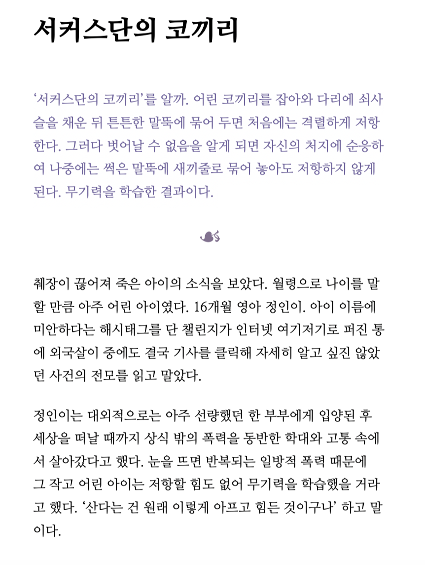 정인이는 대외적으로는 아주 선량했던 한 부부에게 입양된 후 세상을 떠날 때까지 상식 밖의 폭력을 동반한 학대와 고통 속에서 살아갔다고 했다. 눈을 뜨면 반복되는 일방적 폭력 때문에, 그 작고 어린 아이는 저항할 힘도 없어 마침내 무기력을 학습했을 거라고 했다. ‘산다는 건 원래 이렇게 아프고 힘든 것이구나’ 하고 말이다.