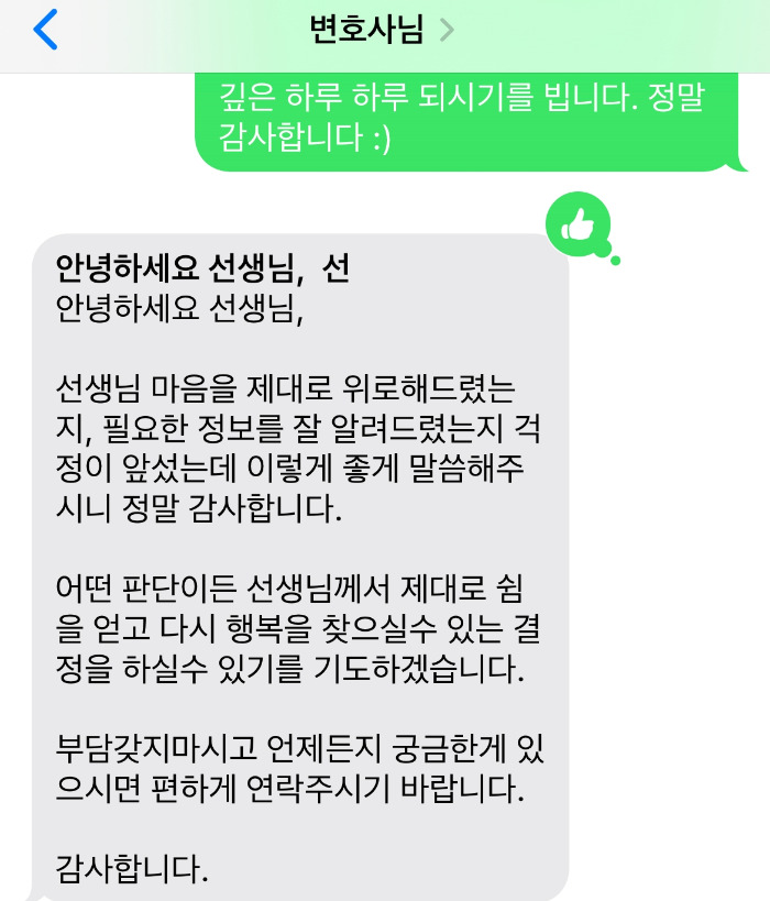 "제가 위로를 제대로 받았어요. 변호사님, 그날 상담하고, 이번에 서류 제출하고 와서 쓴 게 있는데 통화 끝나고 보내드릴게요. 그냥 한 번 읽어주세요."