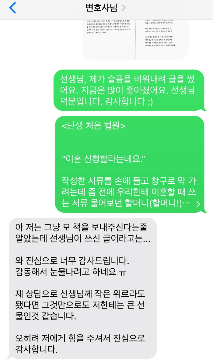 언제든 또 연락 달라는 말을 변호사님의 말을 들으며 전화를 끊은 후 위에 썼던 글을 변호사님께 보냈고, 나는 또 한 번 눈물 글썽이게 하는 답장을 받을 수 있었다.