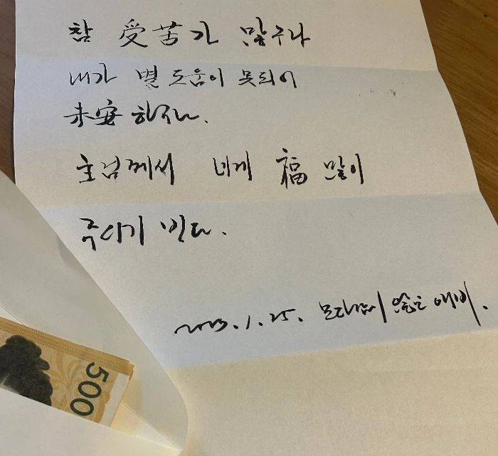 주님이 내게 복 많이 주시려거들랑 애초에 이런 일을 겪지 않게 하셔야지 않겠냐고 아빠는 보지도 못할 댓글을 마음속으로만 달아보았다. 어쨌거나 나를 위하는 아빠의 마음이 참 감사하니, 마음보다 더 소중한 돈은 따로 챙겨 놓고 아빠의 편지도 사진으로 남긴다.