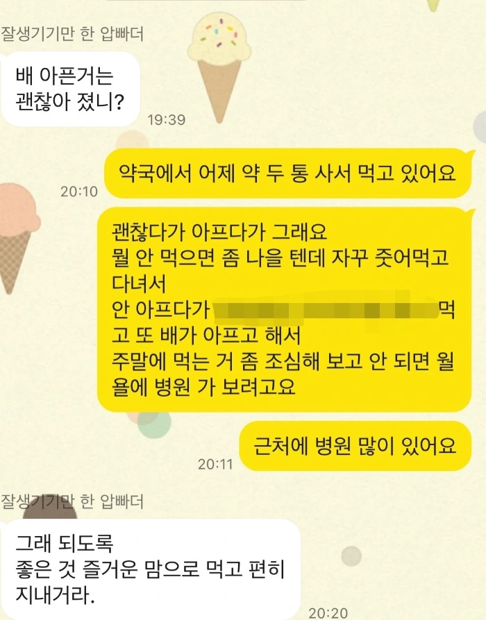 다만 무엇 때문인지 자꾸만 배가 아팠고 (무엇 때문이겠나, 명절맞이 과식 때문이겠지) 맛있는 음식 만들면서, 식탁 차리면서 계속 주섬주섬 집어 먹다 보니 배가 낫다가도 자꾸 다시 아파왔다. 돌아오는 날에도 짐을 챙기며 배가 아프다고 중얼거렸더니 아빠는 계속 아프면 병원에 가 보라고 말씀하셨다. 넹넹 하고 대답은 했지만 애들 챙기고 짐 풀고 출근도 하느라 병원 가는 걸 깜빡했다가 또 배가 아파 결국 약국에 들렀는데 다음 날 아빠한테서 카톡이 왔다.