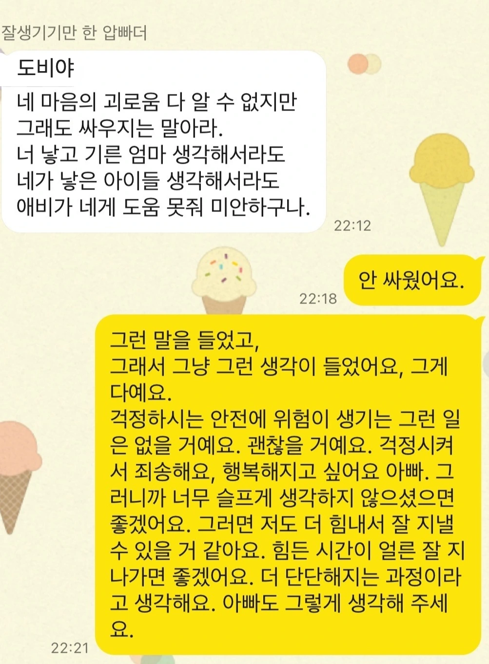 내가 처음 휴대전화가 생긴 중학생 때부터 지금까지 종종 문자로 나름의 좋은 말을 남겨 주셨으니 아빠의 이런 애정 표현은 역사가 상당히 오래되었다. 그래도 최근 들어 새로워진 점이 있다면? 이혼하고 싶다고 전화하면서 내가 생애 최초로 아빠 있는 데서 많이 울었듯 아빠도 내가 이혼하면서 자꾸 대놓고 걱정을 해 준다는 것. 아빠도 이혼하는 딸은 처음일 텐데, 다 늙어서 고생이 많으시다.