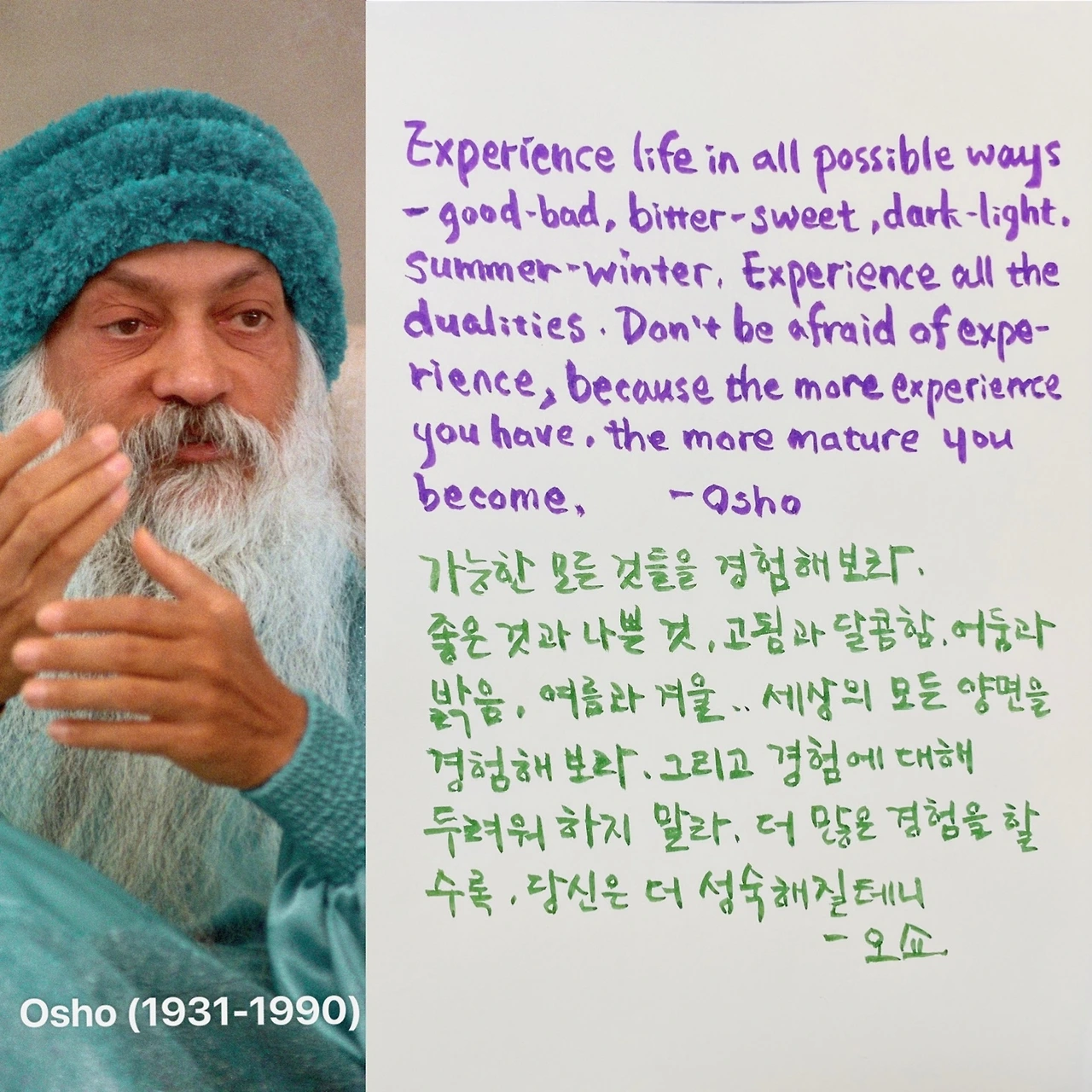 “Experience life in all possible ways --good-bad, bitter-sweet, dark-light, summer-winter. Experience all the dualities. Don't be afraid of experience, because the more experience you have, the more mature you become.” - Osho