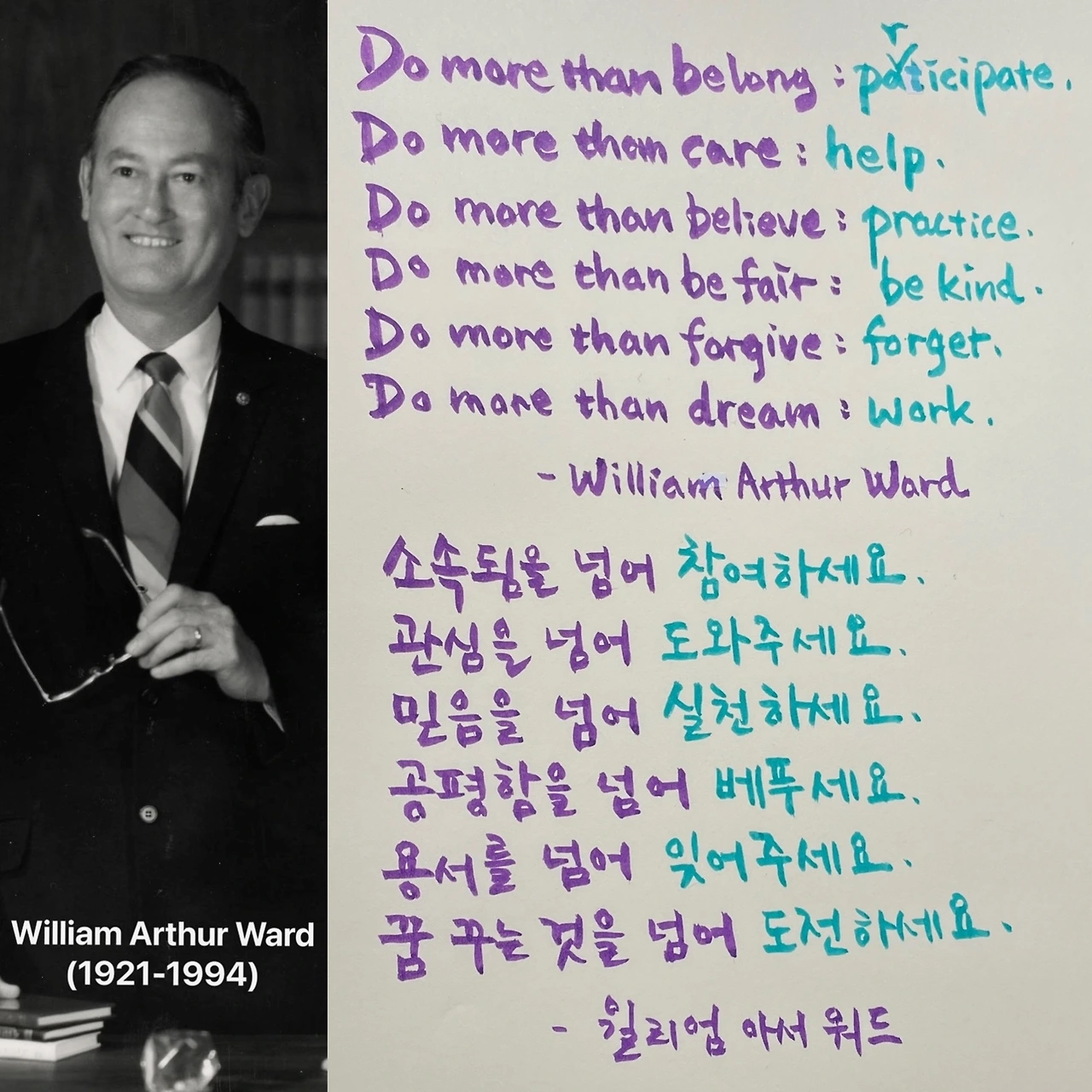 Do more than belong: participate. Do more than care: help. Do more than believe: practice. Do more than be fair: be kind. Do more than forgive: forget. Do more than dream: work. - William Arthur Ward