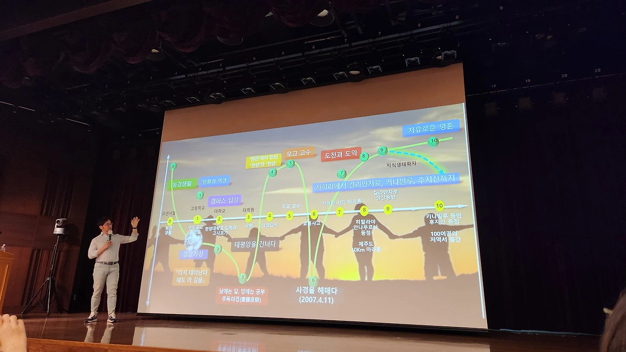 재미있는 강의에 시간이 훌쩍 지나갔다. 물론 유영만 교수의 지나친 언어유희, 억지스러운 아재 개그는 종종 당혹스러웠지만, 그것은 청중의 재미를 위한 강사의 노력에 대한 나의 옹졸한 반응일 뿐, 많은 사람들이 아주 즐거워했다. 나는 특히 그의 경험에서 나온 반성과 발견들이 마음에 와닿았다. 큰 사고를 겪고 투병 중에도, 사하라 사막의 사투의 순간에도, 이 고통과 좌절의 경험들을 어떻게 글로 쓸 수 있을까를 고민했다고 한다. 집념일까 집착일까. 그는'생각하는 대로 살지 않으면 사는 대로 생각하게 되다.'라는 폴발레리의 말을 이렇게 바꾸었다.