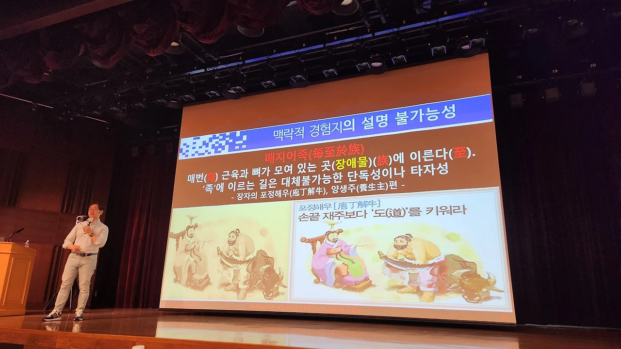 여러분 제가 오늘 여러분 앞에서 강의를 할까요 아니면 강연을 할까요? 강의는 머리를 채워주고 강연은 가슴을 뛰게 합니다. 유영만 교수는 강의 중에 '가슴을 뛰게' 하는 이란 말을 많이 했다. 그의 강연은 어떤 논리를 펼치거나 지식을 채우는 강의가 아니고 가슴을 뛰게 하는 강연이다. 그는 청중에게 머리로 생각하지 말로 몸으로 생각하라고 말한다. 도전하고 경험하여 자기만의 새로운 경지를 이루라는 이야기이다. 그의 강의는 다음과 같은 요지로 이어졌다.