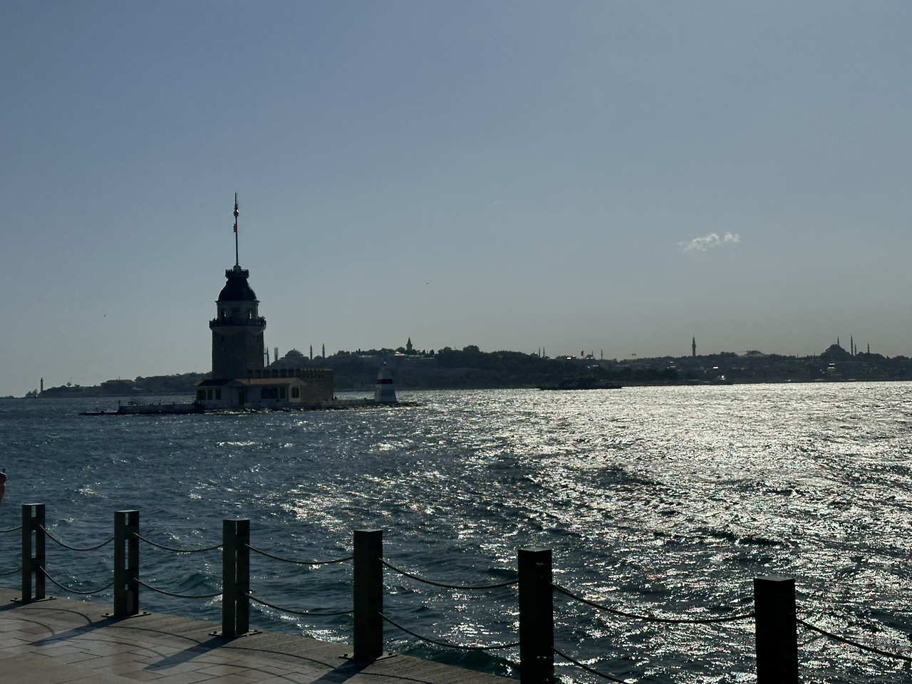 이스탄불 아시아 사이드에서 보스포러스 해협 위로 보이는 하늘은 맑고 연한 하늘색(色)이고, 바로 앞의 바다 또한 투명하고 진한 바다색(色)이네요. 그리고 하늘과 바다의 경계에는 설명하기 어려운 형형색색(形形色色)의, 과거 비잔티움 혹은 콘스탄티노플이라 불리던 구시가지가 강한 햇빛 탓에 살짝 아련하게 보입니다. 지금은 파티흐(Fatih) 구(區) 내의 술탄 아흐멧(Sultan Ahmet) 지구인 이스탄불의 구시가지는, 아야 소피아(Aya Sophia), 블루 모스크(Blue Mosque), 그리고 톱카프 궁전(Topkapı Sarayı)까지, 모두 햇빛을 잔뜩 받은 상태로! 하늘과 바다의 경계인, 처녀의 탑 바로 뒤에서 그 윤곽을 보여주고 있습니다. 한편, 그 바로 앞에 보이는 '처녀의 탑'은 아시아 지구 쪽에 가까운 바다 위로 유유히 떠 있네요. 그리고, 햇살을 잔뜩 머금은 보스포러스 해협의 파도는 이쪽으로 계속 넘실넘실 흘러오고 있습니다.