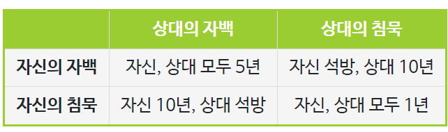 책임감 없는 인간의 속성을 단순하게 보여주는 모델이 바로 '죄수의 딜레마'다. 수학자 존 내시가 고안한 게임 이론이다. 수사관은 공범으로 의심되는 두 사람을 부르고, 자백하라고 말한다. 두 사람에게는 각각 두가지 선택권(자백 or 침묵)이 주어지므로 경우의 수는 4가지다. 이때, 한 사람이 다른 사람의 뒤통수를 치기로 결심하면(본인은 자백하고, 상대는 침묵) 침묵을 선택한 사람에게만 징역 10년 형이 부과된다. 반면, 자백한 본인은 석방 당한다.