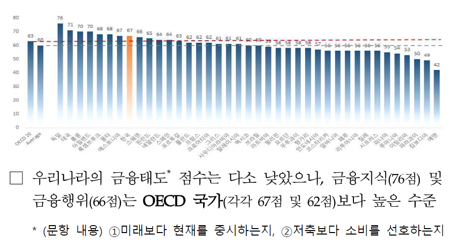 금융태도란 당장의 소비보단 미래를 고려한 저축습관을 의미하는데, 우리나라 국민 금융태도 점수는 평균보다 낮다는게 특이점이다. 알긴 아는데, 행동하지 않는다는 뜻과도 같다. 그러니 행동까지만 하면 얼마나 강한경쟁력을 갖출 수 있겠나.