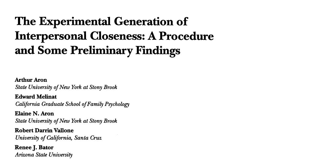 소개팅에서 상대에게 하면 좋을 질문 몇가지를 준비했다. 개인적인 뇌피셜이 아니고 대학의 심리학과 교수의 연구 결과를 통해 만들어진 질문 리스트다. 더 자세히 찾아보고 싶은 분들은 스토니브룩 대학교의 아서 아론 교수를 검색하거나, 원 논문인 'the experimental generation of interpersonal closeness a procedure and some preliminary findings'를 검색하면 된다.