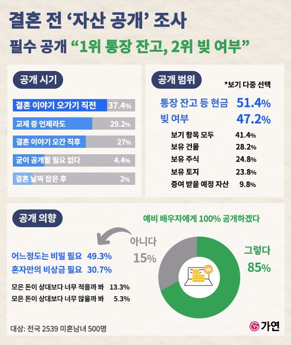 17일 결혼정보회사 가연이 2539 미혼남녀 500명(남·녀 각 250명) 대상으로 ‘2024 결혼 인식 조사’를 실시했다. 그 결과 미혼남녀가 결혼 전 상대에게 필수로 공개해야 할 것은 '통장 잔고'와 '빚 여부'인 것으로 나타났다.