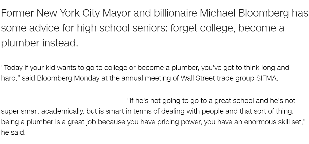 나는 길을 걷다가도 길에서 소위 말하는 노가다(?) 업무를 하는 분들을 유심히 보곤 한다. 그들 연령대가 대부분 60대 언저리처럼 보이는데, 온몸이 근육질이다. 목소리도 우렁차고, 척추뼈에 힘이 넘치는 걸 본다. 반면 평생을 양복입고 사무실에서만 보낸 사무직들은 60대가 되면 허리가 굽고 거북목이 오는 등 신체가 불균형해지는 걸 본다. 앞으로 블루칼라의 시대가 온다는 말이 허튼 소리가 아니다. 억만장자인 마이클 블룸버그 전 뉴욕시장도 "하버드 진학보다 배관공을 하는 게 낫다"고 말했다.