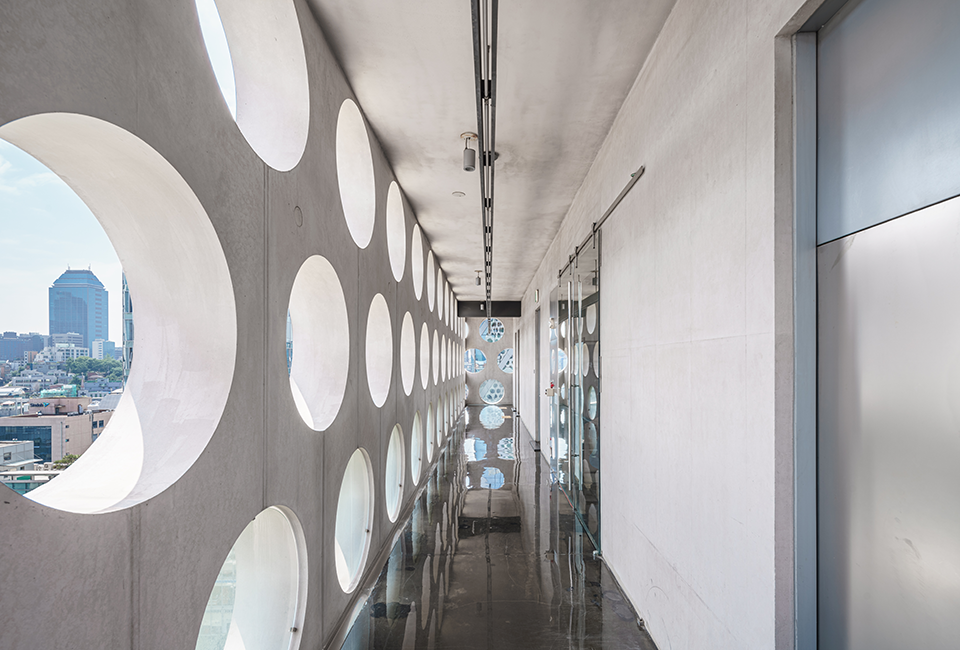 어반파이브에서 가장 눈에 띄는 특징은 벌집 모양의 외관입니다. 지름 1m 크기의 원형 구멍이 3300개 가량 뚫려 있습니다. 이 외관은 건물의 자연 채광을 돕고, 창문 크기를 자유롭게 조절하여 에너지 효율성을 높이는 역할을 합니다. 이 벌집 형태는 콘크리트 구조로 이루어져 외벽을 보강하면서도 건물의 조형미를 돋보이게 합니다. 17층 높이의 건물을 전체 콘크리트로 만든 경우는 세계적으로도 드뭅니다. 높이 올라가면 하중을 감당하기 어렵기 때문입니다. 넓고 큰 면을 노출콘크리트로 매끈하게 처리하는 것 또한 기술상 난이도가 높습니다.