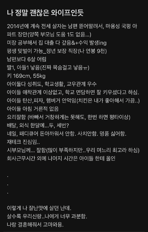 나는 아직 이혼은 안해봐서 그 경험치는 미처 이야기를 못한다. 하지만 만족스러운 결혼생활과 가정 이런 것들에 대해서는 조금이나마 털어놓을 수 있다. 자랑처럼 들릴까봐 조심스럽긴 하지만. 그저 한국에서 결혼하고 애 낳고 사는 여자 중 그럭저럭 만족하고 감사하며 사는 여자도 있다는 이야기를 하고 싶었다. 반드시 이곳이 불만과 불행만 털어놓는 곳이 아니지 않은가.