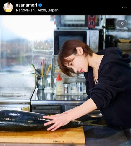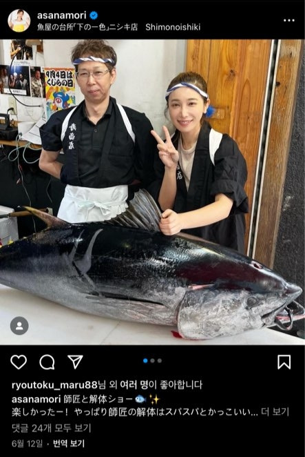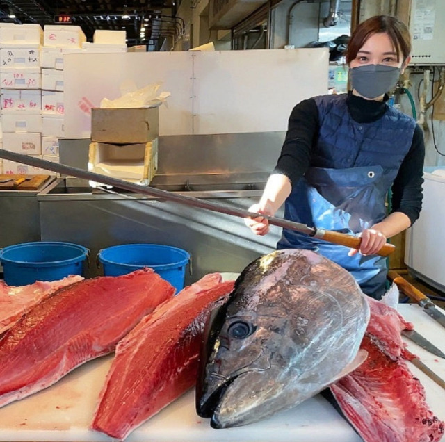 예쁜 외모로 대형 사시미칼을 들고 자신의 몸보다 큰 참치를 해체하는 쇼를 보이고 있다.
