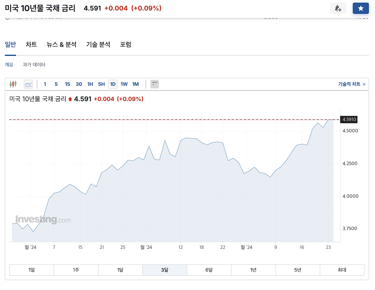 미국 10년물 국채 금리가 계속 오르고 있다. 최근 3달 기준으로 가장 높은 지수를 기록하고 있다.