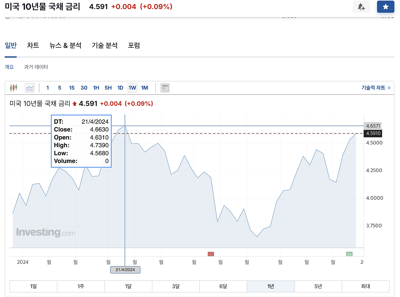 미국 10년물 국채 금리는 1년을 기준으로 4월21일에 최고점을 찍었는데, 이때 주가 조정이 왔었다.