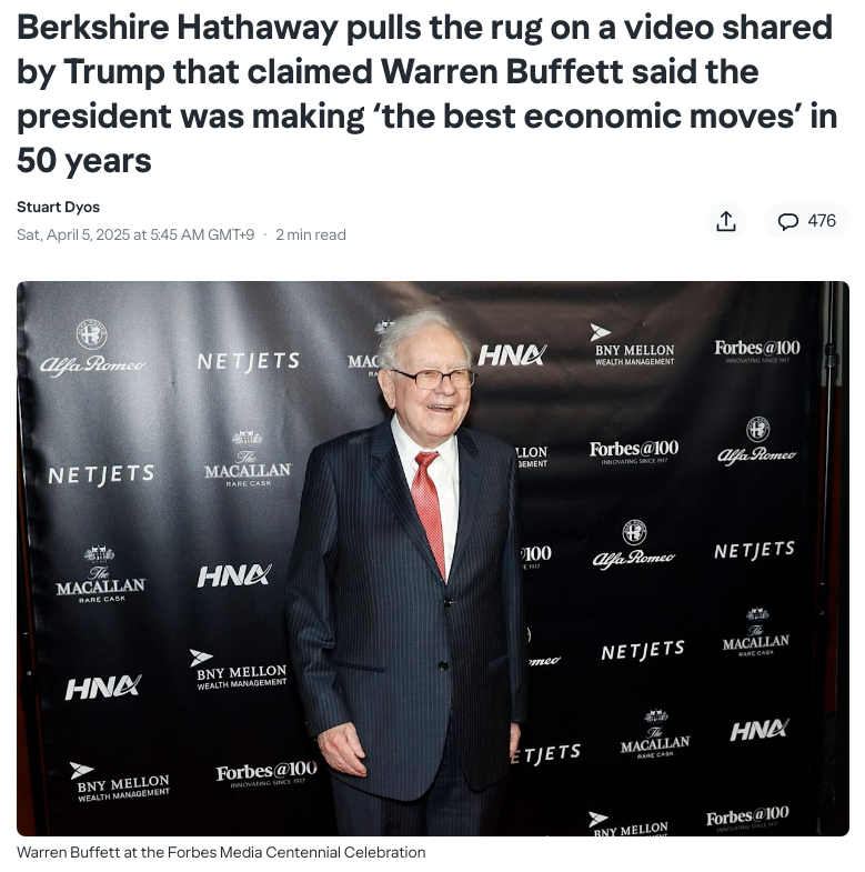 트럼프는 버핏이 "트럼프가 50년 동안 최고의 경제 조치를 취하고 있다"면서 "트럼프가 이번 달 주식시장을 의도적으로 20% 떨어트렸다. 트럼프가 50년 동안 최고의 경제 조치를 취하고 있다고 말하는 이유"라고 버핏이 말하는 영상을 공유했다.