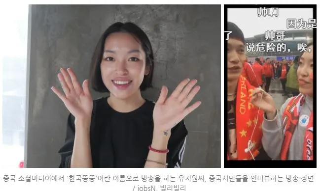 이 여성은 한국인 유지원(25)씨. 중국 소셜미디어에서 활동하는 한국인 '1인 방송제작자'(크리에이터)다. 방송에서는 '한국뚱뚱'(韓國東東,韩国东东)이라는 이름을 쓴다.