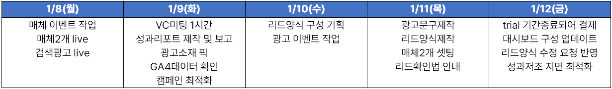 광고주와 미팅을 잡았고, 캠페인 이벤트 작업에 온보딩에 광고성과 분석 대시보드 생성에 T&D 생성, 키워드 확장 등등을 했다.
