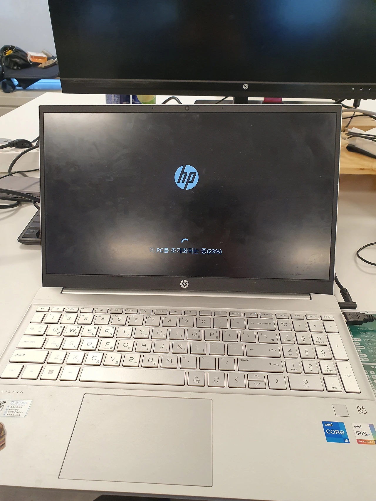 정리된 책상, 초기화되고 있는 노트북. 회사에 있을동안 분신이었는데 화면에 지문이 잔뜩 찍혀있는거 초기화 되는 것을 보니 이상한 기분.퇴사 준비는 정말 치열했다.