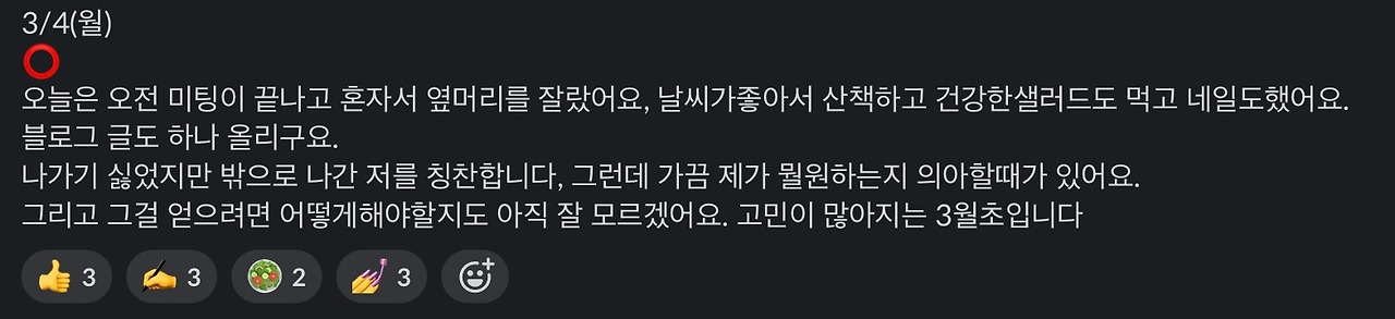 *마지막 3문장. ‘그런데 가끔 제가 뭘 원하는지 의아할 때가 있어요. 그리고 그걸 얻으려면 어떻게 해야할지도 아직 잘 모르겠어요. 고민이 많아지는 3월 초 입니다.’