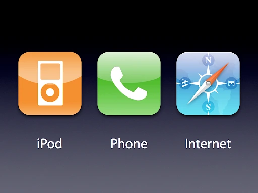 그는 이 세 가지 아이콘을 여러 차례 돌려가며 보여주고, 자신의 회사 apple이 이 세 가지를 하나의 디바이스에 담은 혁신을 이루었다고 선언했습니다.