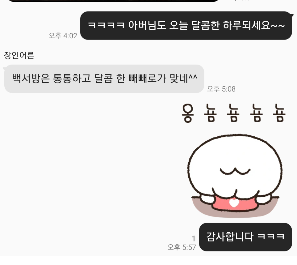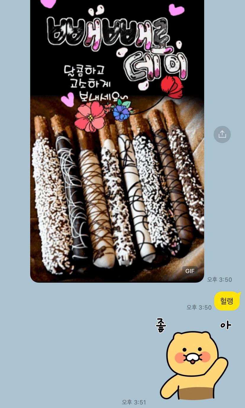 그렇게 흐뭇하게 추억에 잠겨있다가 다시 일을 시작했다. 집안에는 내 숨소리와 타자 치는 소리, 딸그락 거리는 마우스 소리만이 가득했다. 그때, 또다시 카톡이 울렸다. 이번에는 남편이었다. 상기된 남편은 장인어른에게 빼빼로를 받았다며 자랑했다. 아니, 아빠가 사위한테까지 보낼 줄은 몰랐는데, 거 참.ㅋㅋㅋㅋㅋㅋ웃음이 절로 났다. 아빠에게 사위도 빼빼로데이에 생각나는 가족이 되었구나 싶어 뭉클해졌다. 서로에게 마음을 표현하는 것에 낯선 사이였던 우리 가족은, 조금씩 조금씩 변해 가는 듯하다.