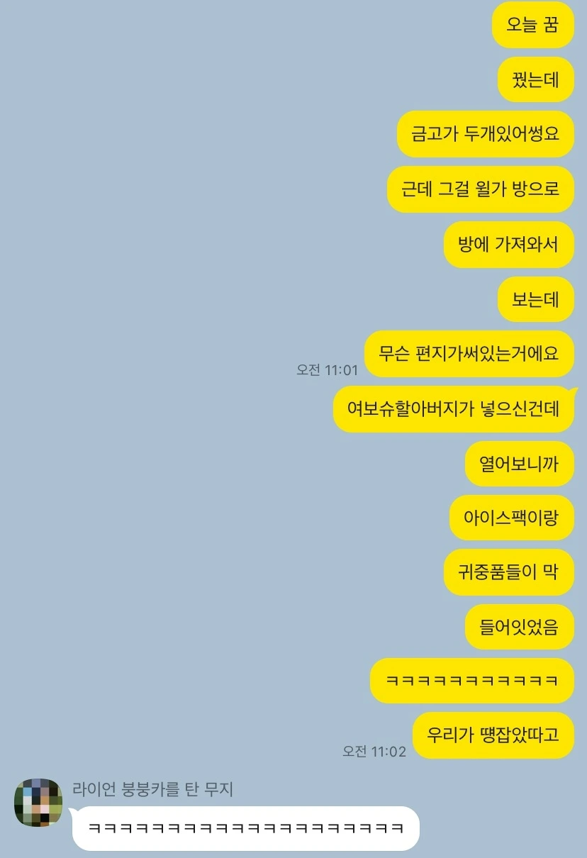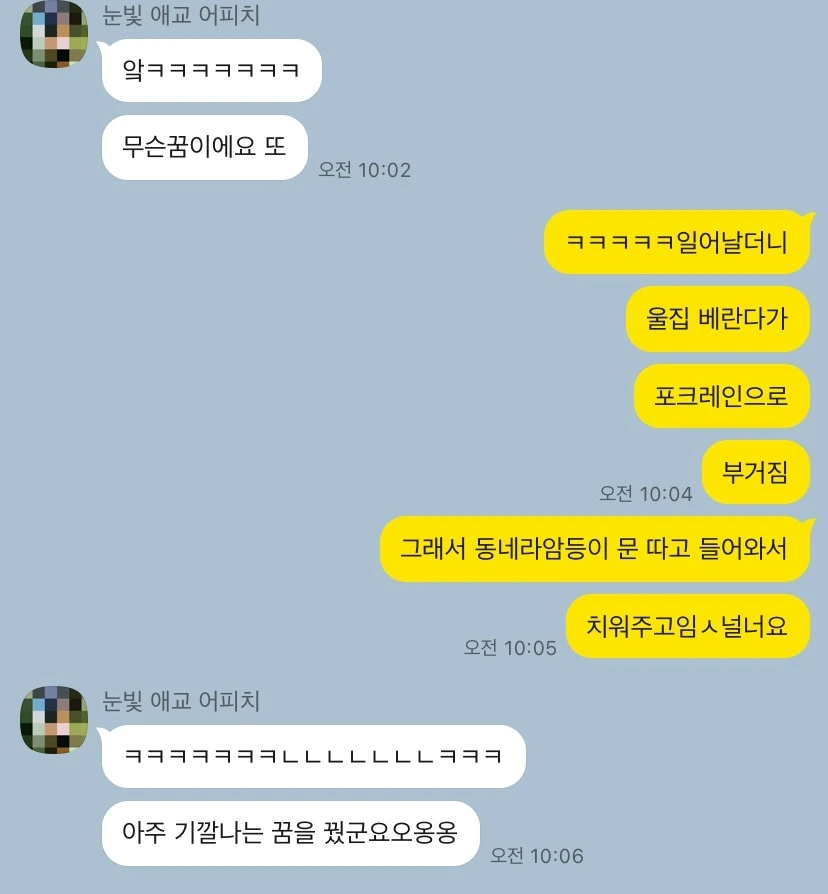 대부분의 아침은 꿈에서 깨어나는 것으로 시작하는데, 보통 이런 식으로 남편에게 꿈 이야기를 보냈다. 가끔 너무 잔인한 꿈이 현실적으로 나오는 날이면, 전화를 하기도 한다. "그건 꿈이야, 괜찮아"라는 말을 듣는 순간 아, 그렇지. 이건 꿈이었어. 금세 안정을 되찾고 하루를 시작한다.