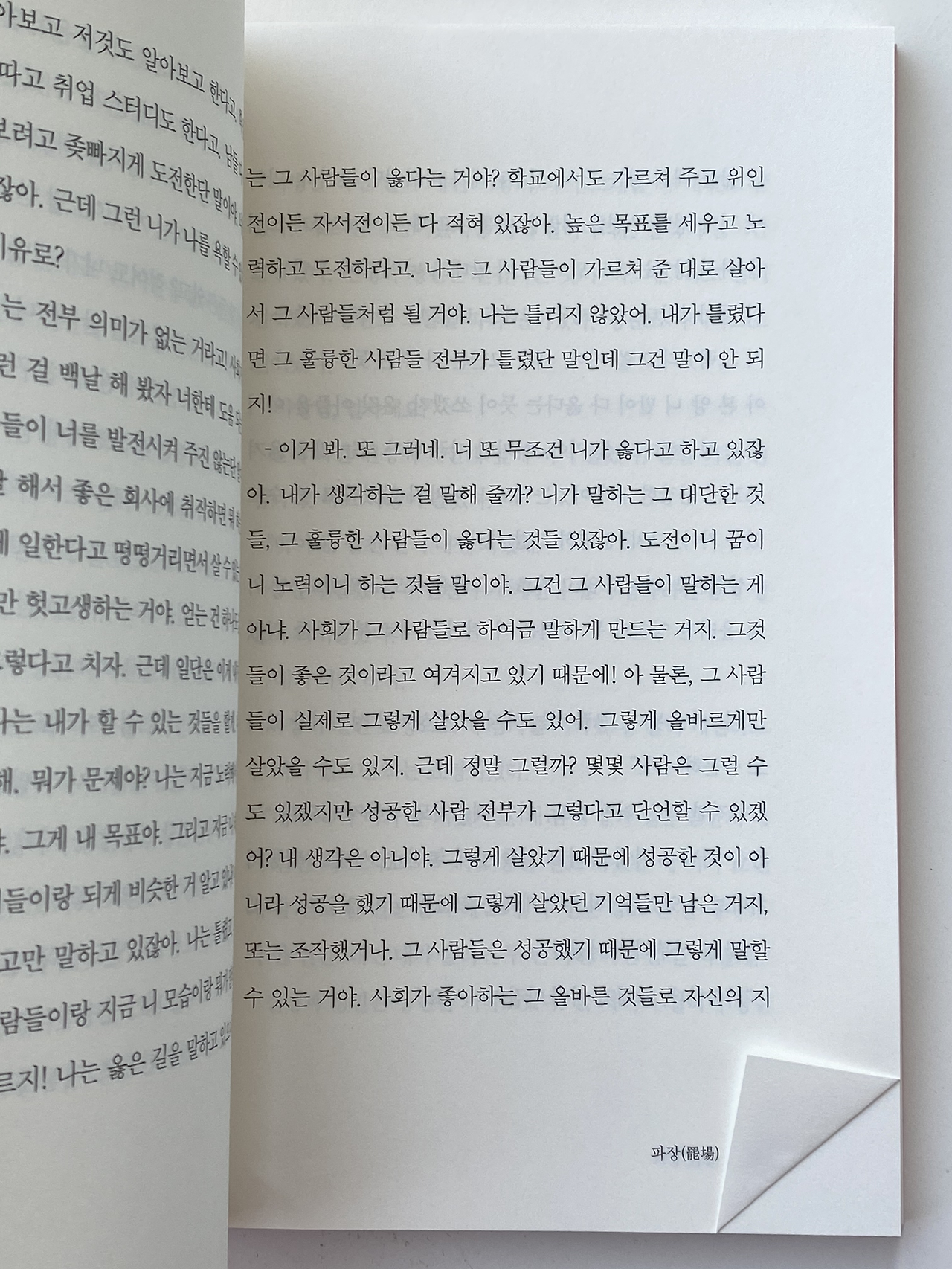 마음에 드는 구절이 나오는 페이지가 있으면, 책 끝 모서리를 접는 습관이 있다. 이책에서는 파장 부분이 특히 그랬다. 특별한 직업도, 특별한 꿈도 없는 친구 4명이 모여 술자리에서 주고받는 대화속에서 나는 나의 20대를 들여다봤다. 아, 나도 저런 말을 한 적이 있었지하면서. 파장에 나오는 대사들은 취업난,이직난을 살아가는 우리네 모습과 많이 닮았다. 그리고 대사들이 참 찰지다. 마치, 내가 저 친구들이 있는 술집에 있는 것 같은 착각이 들 정도로. 내 옆에서 떠드는 것만 같다. 작가님도 이런 생각을 많이 하셨던 것인지 생각이 들 정도로, 그 시절 누구나 생각했던 이야기들을 누구나 공감가게 잘 그려낸다.