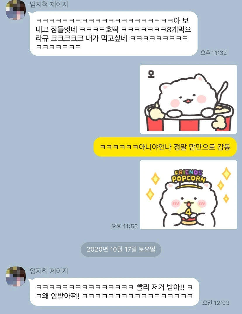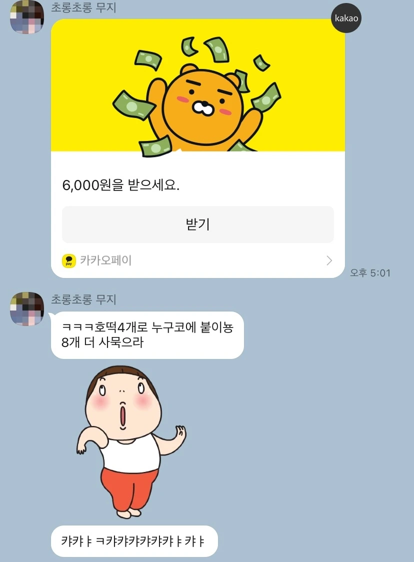 올 초, 코로나가 터지기 전 미국으로 떠난 친한 언니의 카톡이었다. 미국은 분명 새벽일 텐데, 갑자기 카톡을 보냈기에 놀랐는데, 그보다 놀라운 것은 6,000원이라는 금액을 받으세요!라는 라이언의 모습이었다. 아니 언니 이게 뭐야!!! 언니는 인스타를 보고 연락을 한 거였다. 말 안 해도 그거였다. 호떡을 사 먹고 300원이 남았다는 말을 듣고 언니는 곧장 호떡 8개 사 먹을 수 있는 6,000원을 보내기로 결심한 것이다.