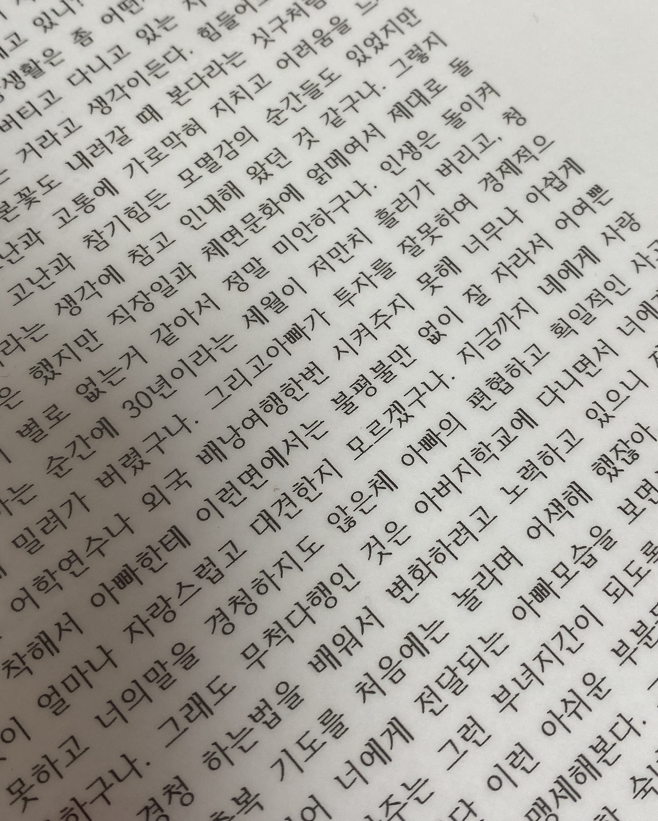 편지에는 고난과 다행이라는 말이 여러 번 쓰여있었다. 아차 하는 순간에 30년이라는 세월이 청춘과 함께 구름 속에 밀려가버렸다고 말하는 아빠, 순간순간 고난과 고통에 가로막히지 말라고, 다 지나가는 순간일 뿐이라며 마음속에 콕콕 박히는 감동문구를 건네는 아빠는 내가 알던 아빠가 아닌 것 같았다. 순간, 대필 아냐? 예시로 문장이 있는 거 아녀? 불효녀의 망상이 시작됐을 때였다.