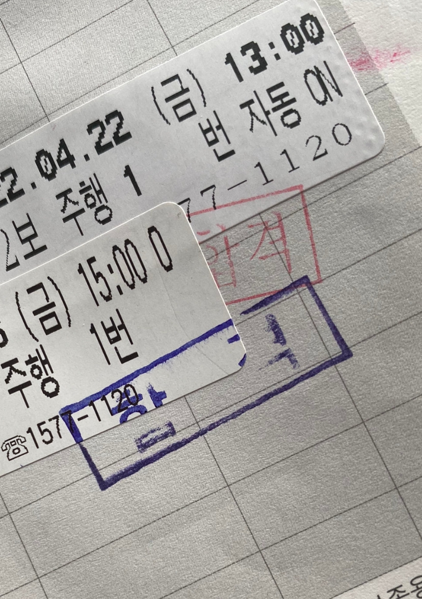 기능시험 합격 맛을 본지 얼마 되지도 않아 <불합격> 도장이 쾅! 하고 찍힌 수험표를 들고 노란 차에서 내렸다. 이제 다시 시작이었다. 도로주행, 이거 생각보다 쉽지 않겠는걸? 기능시험만 붙으면 모든 것이 다 끝나리라 생각했던 건방졌던 나의 의식의 흐름을 뚝 하고 끊어준 사건. 운전시험은 불합격 후 3일 뒤에 바로 재시험이 가능하지만, 나는 그럴 수 없었다. 연습면허 생들은 면허를 취득한 지 2년 이상 된 사람을 동승하에 도로를 달릴 수 있었고, 남편의 휴가 신청에 맞춰 나는 재시험을 볼 수 있었다. 2주 만이었다.