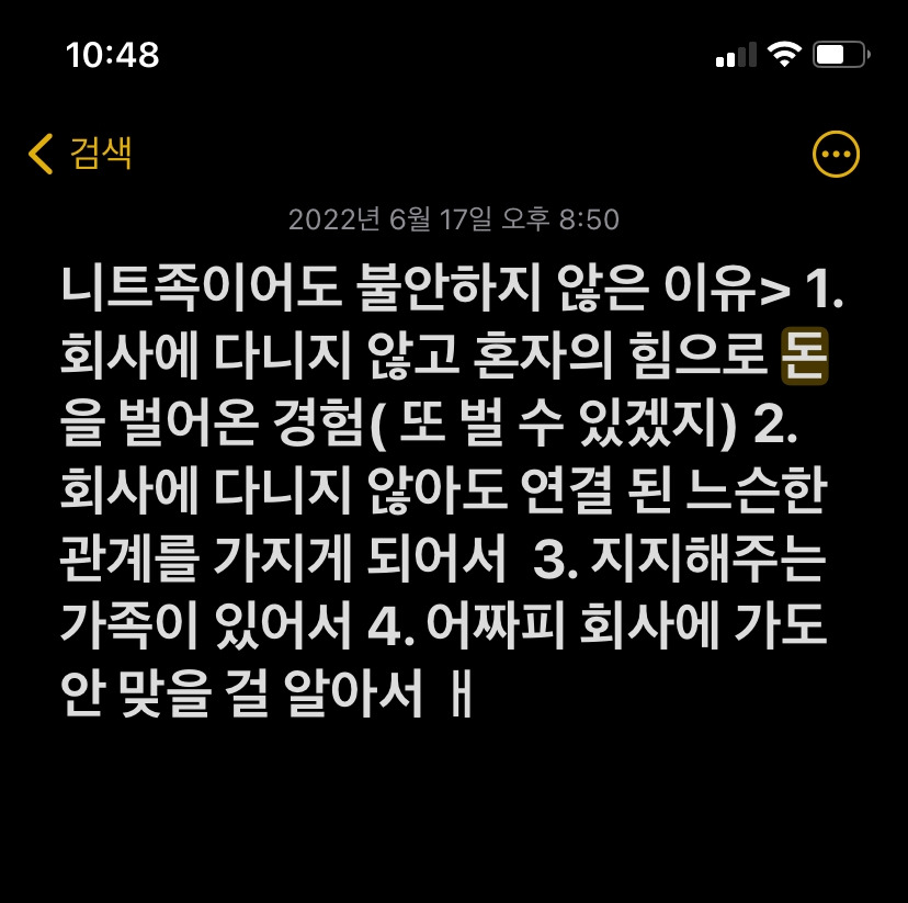 내가 불안정한 니트 생활을 유지하면서도 쉽게 불안해지지 않는 가장 큰 이유는 바로, 경험이었다. 회사 밖에서 돈을 벌어본 경험. 구남친에게 대차게 차였던 글을 썼더니, 연애상담 어플에서 상담사로 활동해달라는 제안을 받았고, 영화채널 편집자로 이력서를 넣었다가 콘티 작가를 제안받아 1년을 벌어먹고 살 수 있었다. 이 외에도 유튜브 작가, 전자책 판매, 블로그 애드포스트 수익, 원고료, 상품등록업무 등등까지 닥치는 대로 했다.