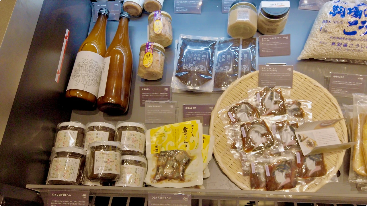 다시오쿠모 매장에 들어서면 가장 먼저 눈에 띄는 것은 36가지 식재료들이 가득 쌓여 있는 모습이다. 마치 한 편의 조용한 정물화를 연상케 하는 이 풍경은 사람들을 단숨에 이곳에 몰입하도록 만든다. 매장에 설치된 보온통을 통해 얼마든지 국물을 시식할 수도 있다. 또한 다시 오쿠모는 국물뿐만 아니라, 식품 마이스터들이 직접 엄선한 간장, 된장, 쌀, 음료 등 일본 전역의 제품들도 판매하고 있다.