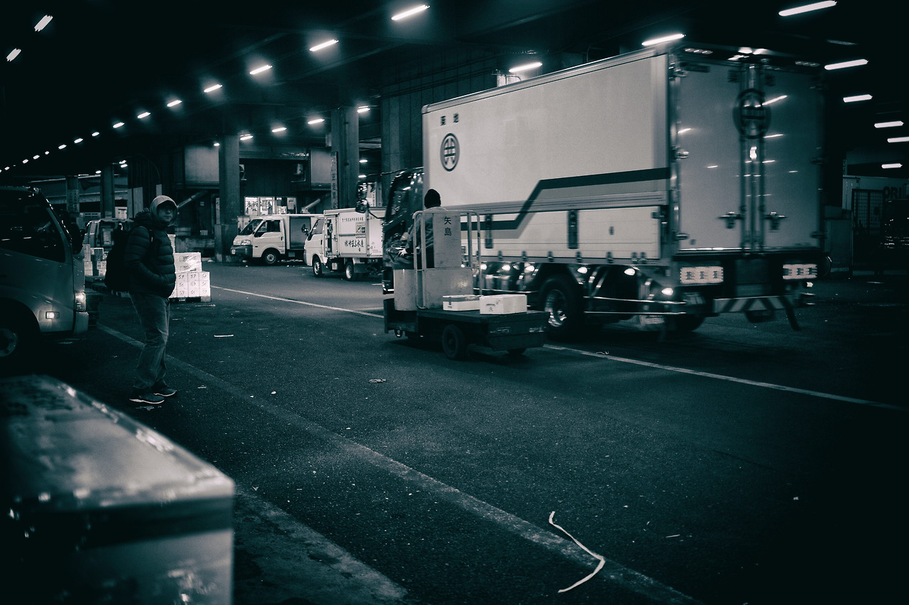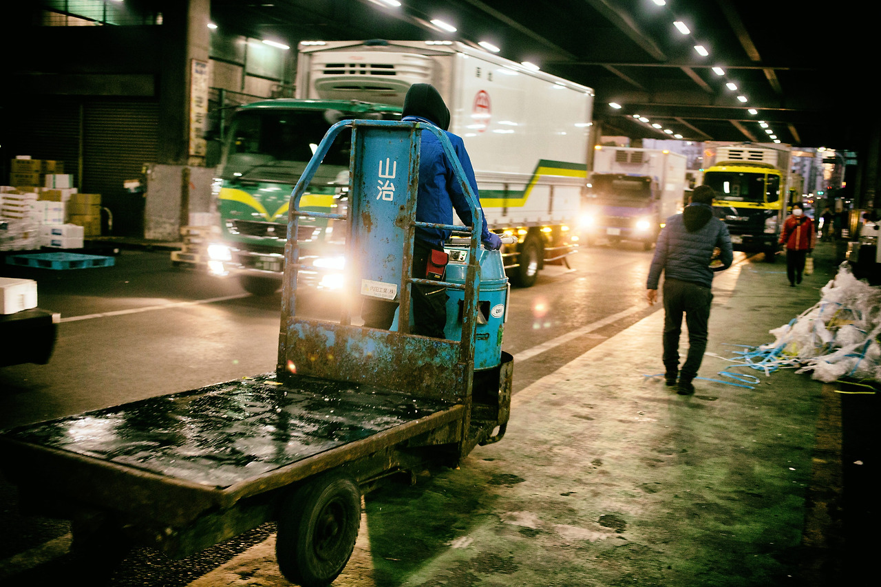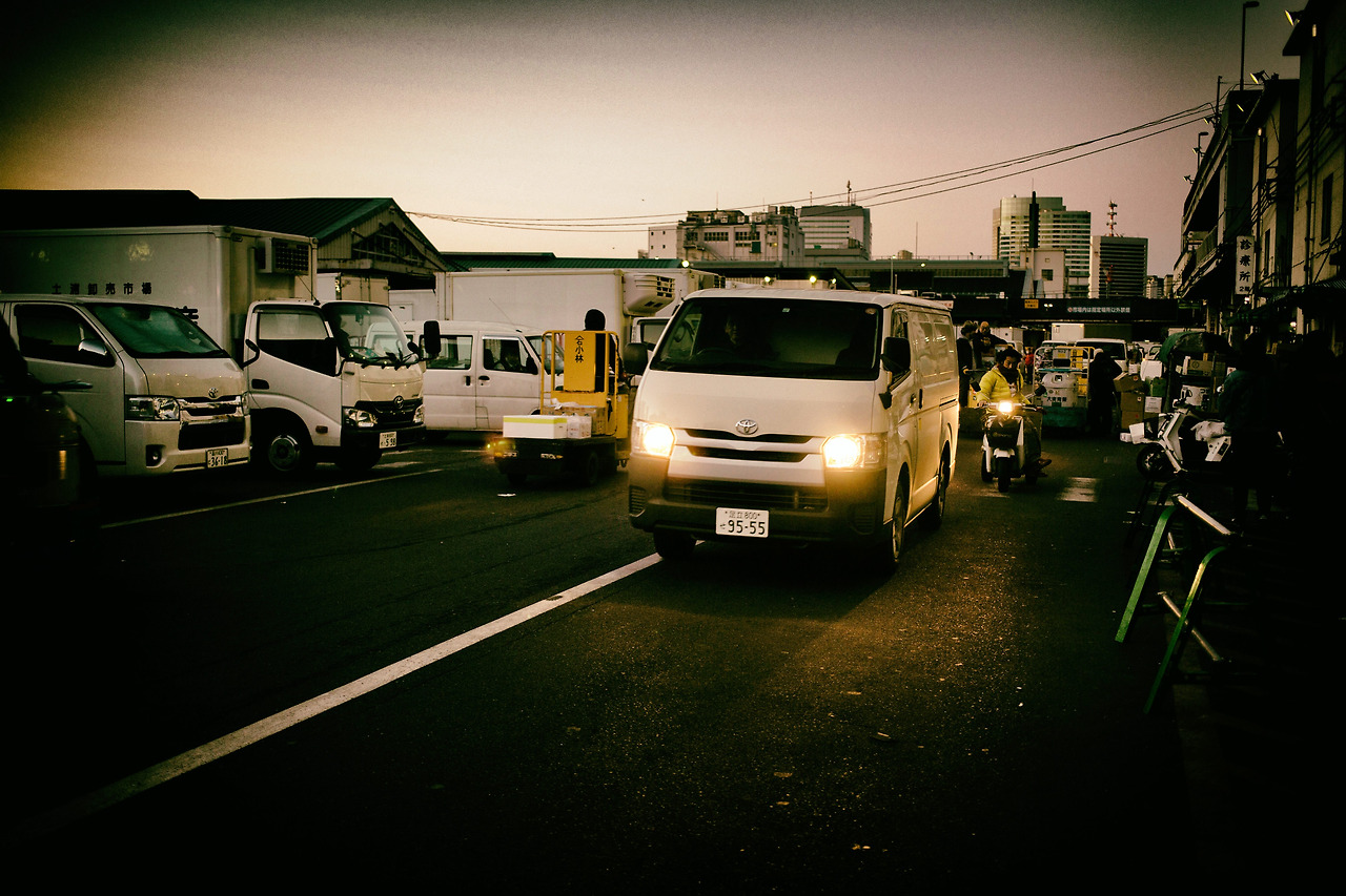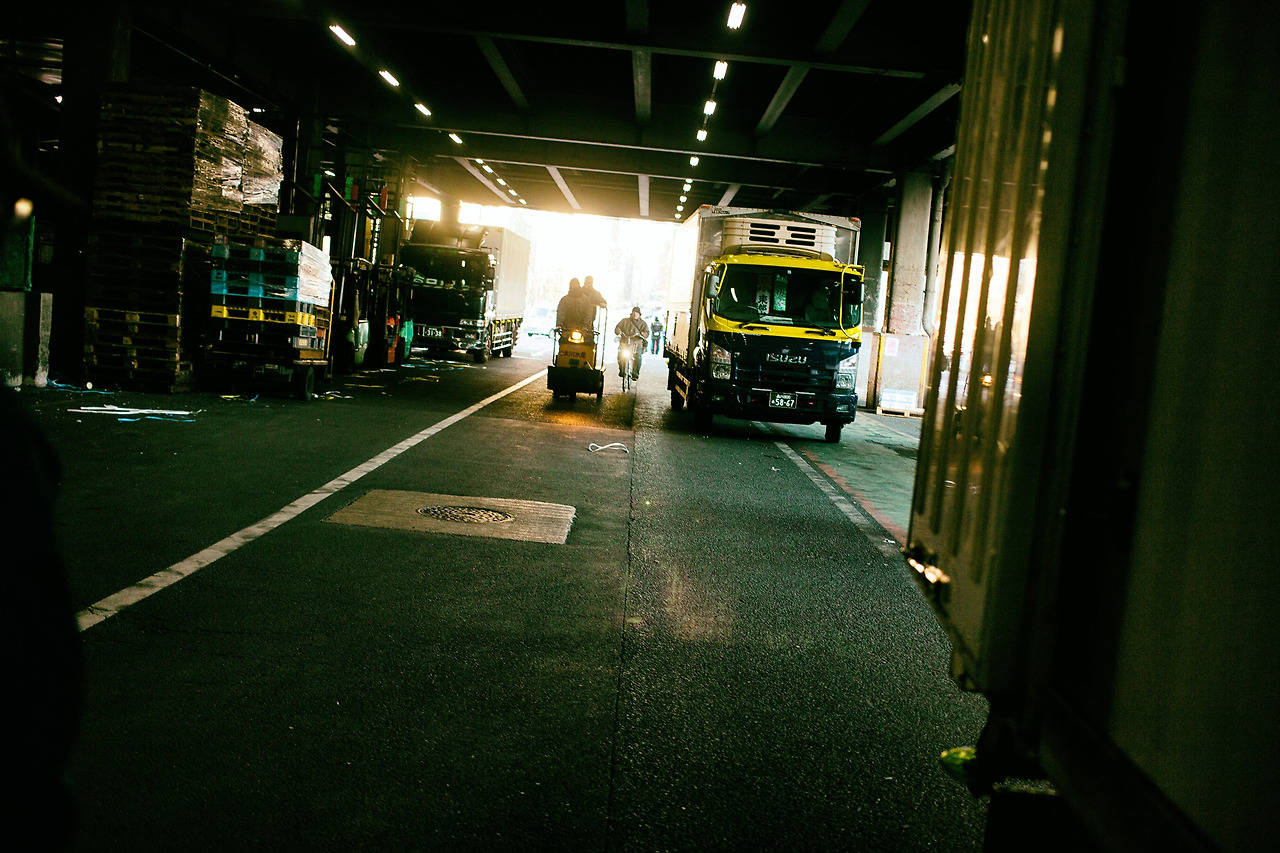 새벽 츠키지 시장은 타레와 자동차가 수시로 계속 지나간다.