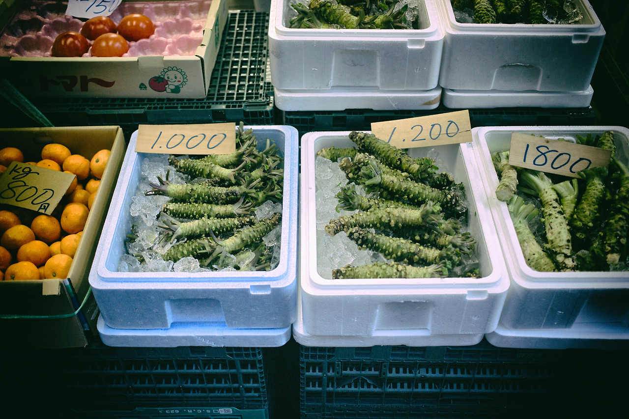 츠키지 시장에서는 쉽게 고추냉이를 볼 수 있다.