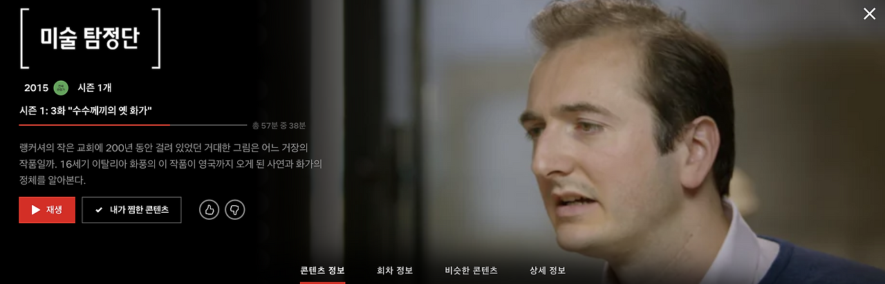 넷플릭스에서 나온 미술 탐정단은 에피소드마다 미술작품의 진위여부를 판별한다. 미술사를 전공하는 이들이 어떤 일을 하는지를 알 수 있으며, 미술작품 판별을 위해서 어떤 과학적인 방법들을 사용하는지 엿볼 수 있는 다큐다.
