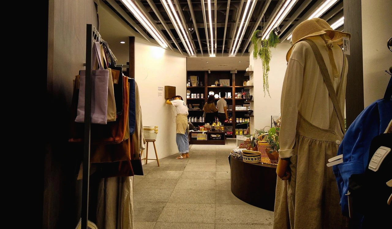 이와 다르게 나무줄기 같은 좁은 통로 공간의 천장은 낮다. 낮은 천장은 사람들이 공간에 더 몰입하게 만든다. 이를 극대화하기 위해 좁은 통로 공간에는 조도가 낮은 조명을 사용해 아늑함을 연출했다. 공간 성격에 맞게 의류, 주방도구, 커트러리 등 '개인 취향'이 강현 물건을 놓았다. 의류코너는 드레스룸처럼 연출해 몰입도를 더 높였다.