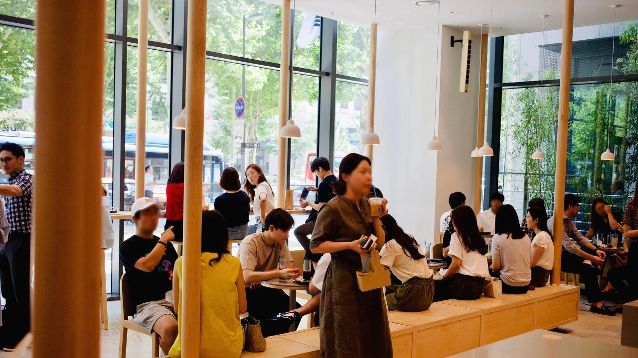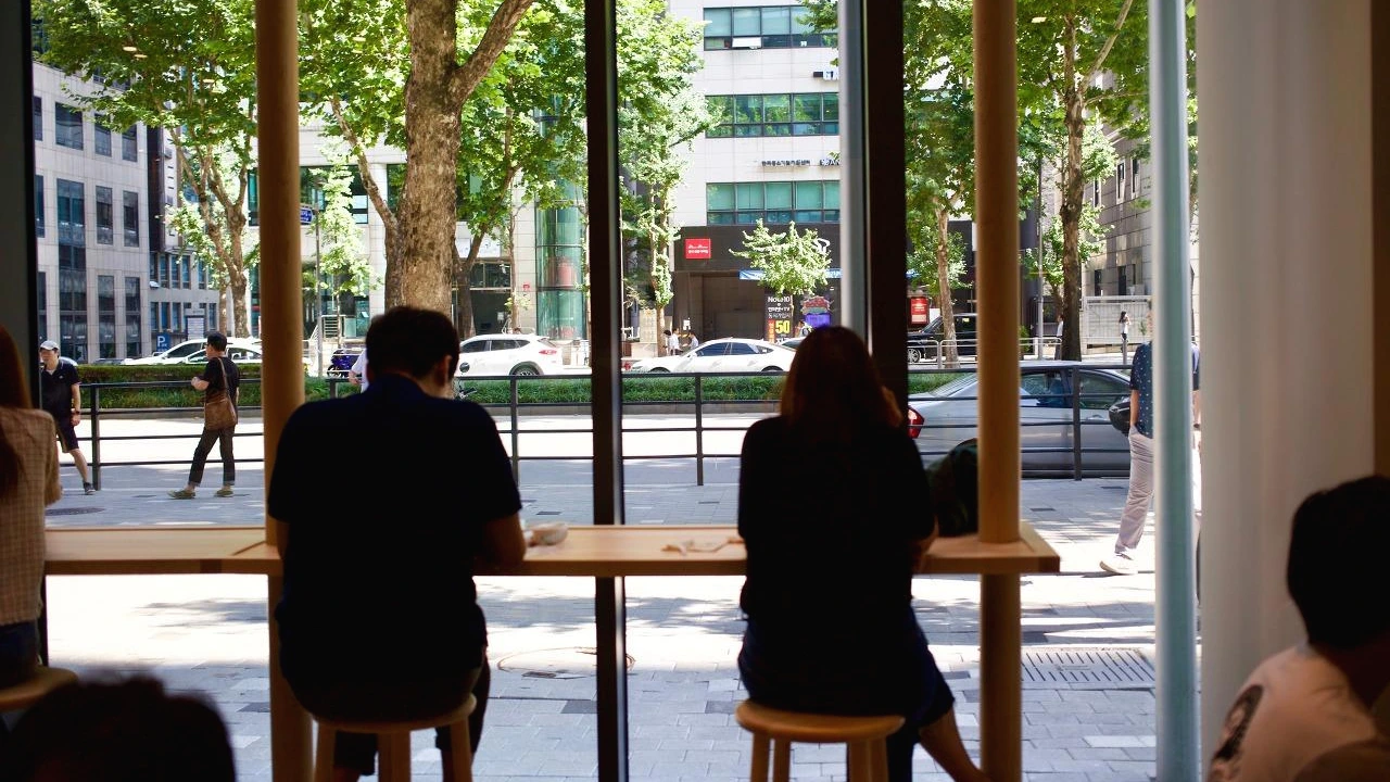 역삼 섬의 가구 색상은 화사하고 밝다. 시원함을 강조한 색감 선택이다. 성수, 삼청, 도쿄 내 매장보다 2,3톤 밝다. 상쾌함 그 자체다. 대나무 숲이 가진 시원함과 채광을 가구가 색으로 보조한다. 특히 단풍나무 소재와 질감이 무척 부드럽다. 성수점과 삼청점의 나무 촉감은 특징이 있다고 보기도 어렵고 공간 속에 '배치된' 느낌이 강했다. 하지만 역삼점에서는 공간을 이끄는 주체 중 하나다. 부드러우면서도 단단한 안정감을 주는 촉감은 공간에 선명함을 더한다. 매장 전체를 채우는 색은 일본풍의 회색이 아니다. 오히려 애플스토어와 유사하다. 아마도 애플스토어에 가본 이들은 비슷한 느낌에 편안함을 느낄지 모르겠다. 애플 매장에서 커피 마시는 느낌?이라고 해야 할까? 매장 내 빈 공간을 자연스럽게 사람들의 목소리, 손짓 , 발짓이 채운다. 역삼점은 공간 자체가 자연스럽기에 성수점보다 더 쾌활하다. 사람과 공간이 이 같이 간다. 이 모든 게 매우 직관적이다.