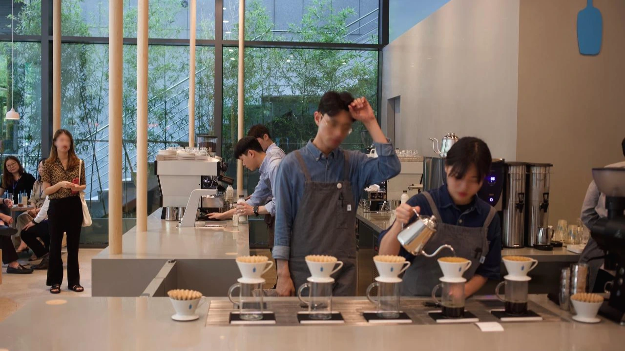 역삼역 4번 출구에서 나와 햇빛을 따라서 내리막길을 걷다 보면 검은색 철 프레임이 인상적인 빌딩이 나온다. 강남 N 타워다. 강남대로의 빌딩 중 하나라고 생각하며 지나갈 무렵 파란 병 로고가 눈에 들어온다. 블루보틀 역삼점. 한국의 세 번째 블루보틀 매장이다.
