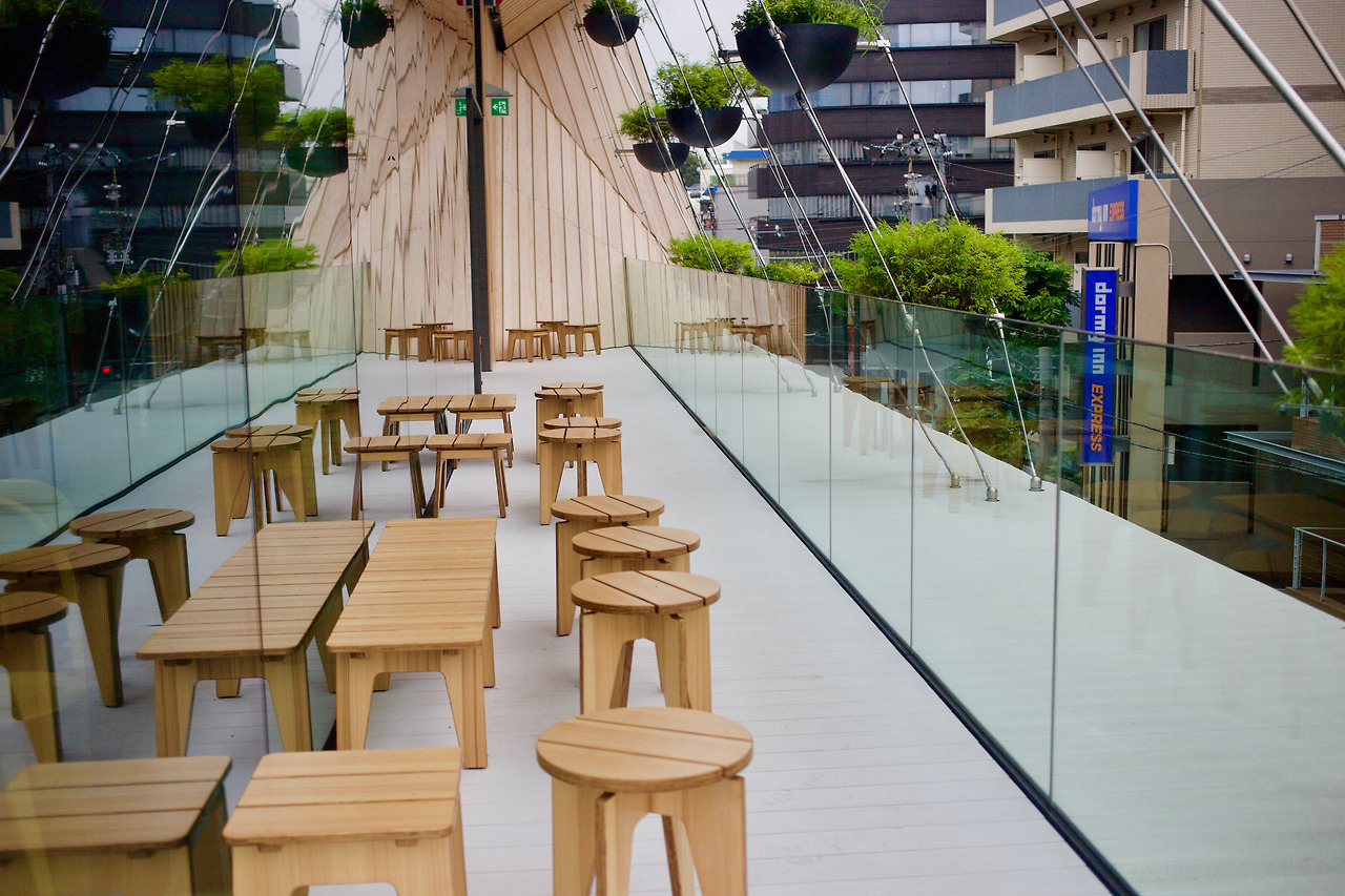 1층부터 4층까지 통유리로 들어오는 풍경은 모두 다르다. 1층이 나카메구로 강 주변의 일반적인 모습이라면 2층에서 4층으로 올라갈수록 메구로와 나카메구로 풍경이 모두 눈에 들어온다. 벚꽃이 필 무렵이 되면 이곳이 아마도 핫플레이스가 되지 않을까 생각한다. 로스터리 도쿄가 메구로와 나카메구로의 풍경을 가져올 수 있는 이유는 통유리를 사용했기 때문이다. 통유리를 통해 주변 자연을 끌어오는 방법은, 정원에 편집된 자연을 만드는 일본 정원 술의 변용이라고도 할 수 있다.'편집된'자연을 가져오는 행위는 일본인들이 유독 선호하는 건축 장치이기에, 이곳은 지극히 일본 미를 가득 담고 있다. 하지만 교토와 도쿄는 정원을 다루는 방법이 사뭇 다르다. 교토에서는 정원을 공간에 생명력을 더하는 도구로 사용한다. 하나 도쿄에서는 정원을 건축에 디테일을 더하는 요소로 사용한다. 스타벅스 로스터리 도쿄는 후자다.