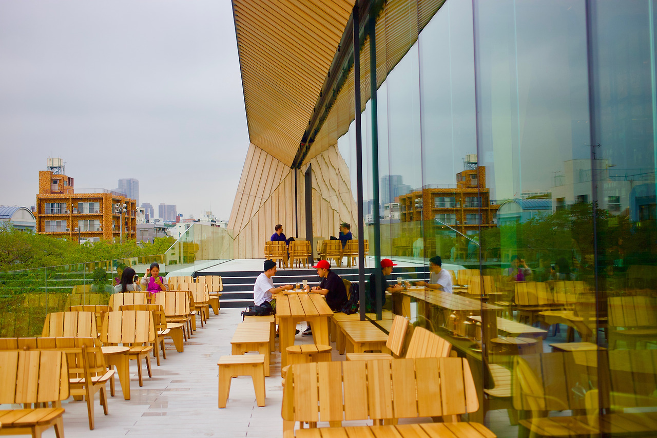스타벅스 리저브 로스터리 도쿄의 건축을 맡은 건축가는 일본 4세대 건축가인 구마 겐고다. 춘천에 위치한 네이버 데이터센터도 그가 만들었다. 도쿄의 유명 관광지인 아사쿠사에 위치한 아사쿠사 관광안내소. 오모테산도의 네즈미술관도 그가 지었다. 구마 겐고가 추구하는 건축은 지는 건축이다. 직선보다는 곡선을 선호하며 철과 나무를 많이 사용한다. 그는 직선보다는 유선형으로 공간과 공간이 이어지게 만든다. 특히 구마 겐고는 겹침을 통해서 직선이 가진 딱딱함을 상쇄시킨다. 스타벅스 로스터리 도쿄도 예외는 아니다. 의도적으로 '직선'을 사선 형태로 만들어 부드럽게 만들었다. 뿐만 아니라, 매장에 비치된 가구들도 부드럽다. 스타벅스 리저브 로스터리 도쿄 매장 안의 모든 가구에는 직선이 적다. 모든 가구들 모서리는 둥글거나 비스듬하다. 딱딱함이 없는 부드러운 가구. 게다가 색은 아주 연한 갈색이다. 공간에 부드러움이 생기는 건 당연하다.