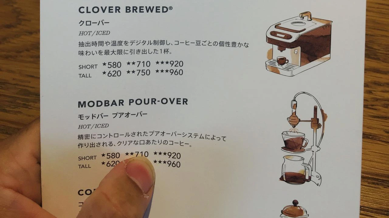 기존 스타벅스 매장에 가면 메뉴들은 카페 바 뒤에 붙어있다. 손님들은 바리스타 뒤에 있는 메뉴를 보고 손으로 가르치며 주문하면 된다. 하지만 로스터리 도쿄에서는 식당같이 메뉴판을 펴야 한다. 뿐만 아니라 직원과 대화를 해야 하면서 주문해야 한다. 또한 기존 스타벅스에서 판매하던 메뉴가 하나도 없다. 기존 스타벅스 매장 이미지가 너무 강하다 보니, 많은 이들이 스타벅스 리저브 로스터리 도쿄에 와도 어떻게 주문을 을 해야 할지 모른다. 다들 당혹해하면서도 즐거워한다. 매우 낯설지만 반가움을 주는 단어는 '숏'과 '톨' 두 가지로 나와있는 사이즈다. 그 외에는 기존 스타벅스에서 보던 메뉴가 아니다. 완전히 다르다. 당혹스러워하는 순간 정장을 입은 직원들이 재빠르게 주문을 돕고 새로 오는 손님들을 안내한다. 모든 바리스타들이 원두와 추출방법을 설명한다. 사이폰 같은 경우는 분쇄한 원두를 손님에게 주며 원두를 설명하기도 한다.