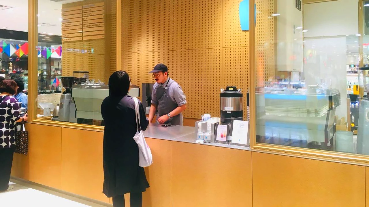 블루보틀 다이마루 점이 테이크아웃 전용 점이다 보니 블루보틀을 상징하는 핸드드립 바가 없다. 오로지 에스프레소 머신을 사용한 블루보틀 커피만 마실 수 있다. 하지만 디카페인만 핸드드립이 가능하다. 하지만 직원은 " 다른 장소에서 커피 드립을 해 매장으로 가지고 온다 "라고 말했다. 블루보틀 특징은 단연코 한 땀 한 땀 내리는 핸드드립이지만 이곳에서는 블루보틀의 핵심을 경험할 수 없다. 상당히 의아했다.