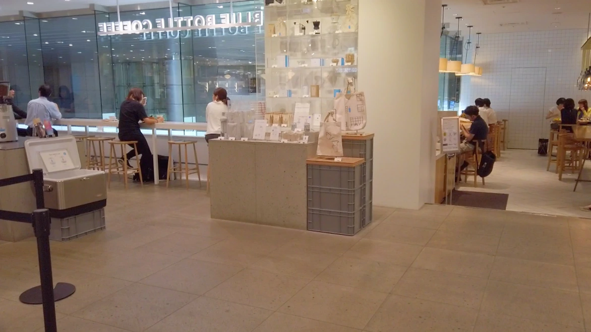 JR시나가와 역을 따라 출구 쪽으로 걸어가면 이세탄 백화점과 atre가 나온다. 이세탄 백화점이 보일 때쯤 예쁘고 깜찍한 파란 병이 하나 보인다. 그렇다. 블루보틀 시나가와 점이다. 시나가와점은 일본 블루보틀 매장 중 유일하게 다른 식당과 붙어있다. 사진처럼 블루보틀 시나가와점과 옆 식당과의 경계가 거의 없을 정도다. 이를 위해서 조명과 바닥 타일, 색상을 활용해서 다른 식당과의 관계로 같이 고려했다.