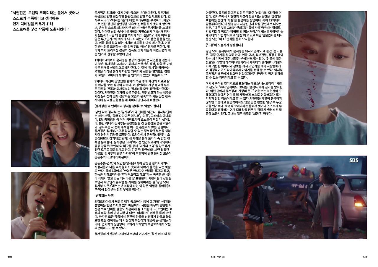 의학드라마에서 딕션은 더욱 중요하다. 용어 그 자체가 상황을 설명하는 힘을 가지고 있기 때문이다. 서현진 배우의 탄탄한 딕션은 의료 단어를 발음도 차분하게 잘 소화한다. 극 초반에는 표정과 의학 용어 단어 사용에 대한 ' 미세하게' 어색한 틈이 보인다. 하지만 모든 작품에서 천천히 인물을 선명하게 만들고 불필요한 점은 걷어내는 게 서현진의 특징이기 때문에 큰 문제는 아니다. 연기력과 상관없다. 오히려 오해영의 후광효과에서 오는 부분이라고도 할 수 있다.