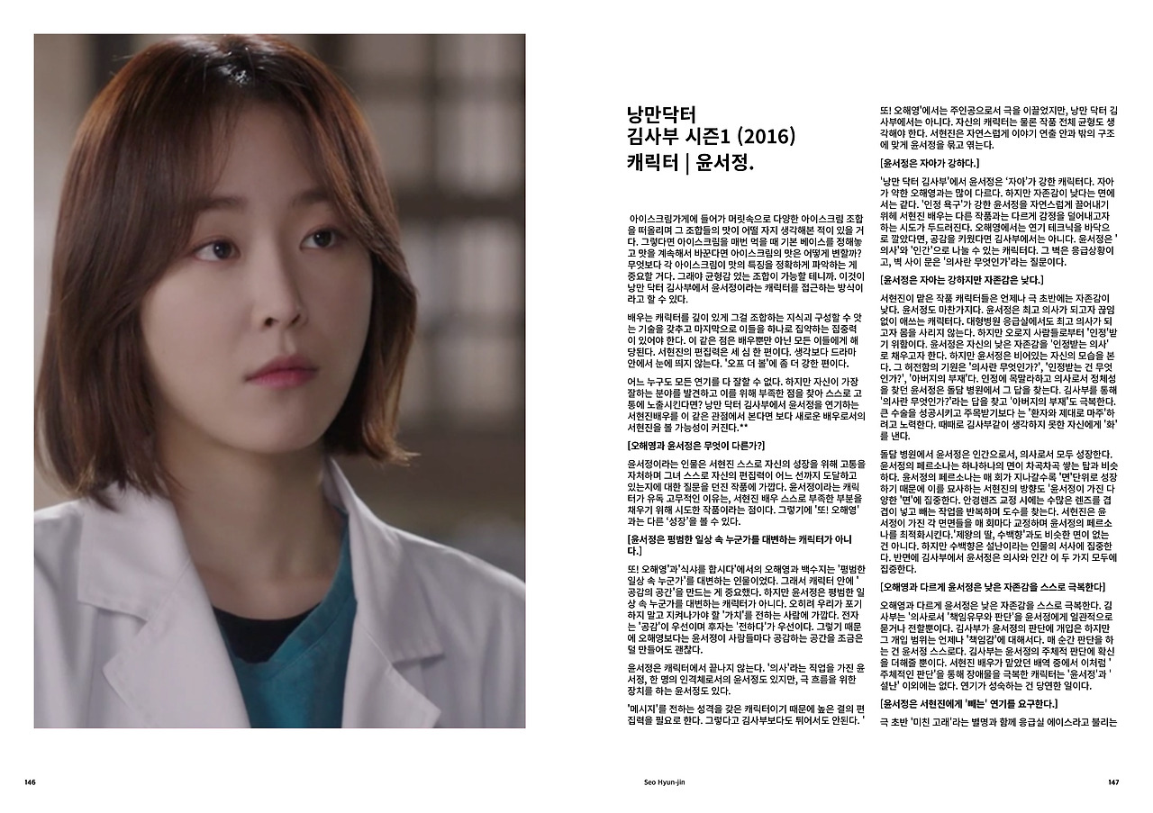 낭만 닥터 김사부에서 윤서정은 매 순간 '순도 높은' 감정 연기를 필요로 한다. 인물 묘사, 정보전달, 감정 진폭이라는 세 가지에 대한 세밀한 분석과 배치는 필수.('의사'로서의 윤서정도 연기해야 한다.) '인물에 대한 정보'를 어떻게 해석하냐에 따라서 캐릭터가 달라진다. 더불어 이에 기반한 이미지와 정보를 가지고 연기을 해야 사람들에게 더 격정적이고 드라마틱하게 이야기를 전달할 수 있다. 이처럼 윤서정은 '배우에게 필요한 편집디자인은 무엇인가?'라는 많은 생각을 던지는 캐릭터라고 할 수 있다.