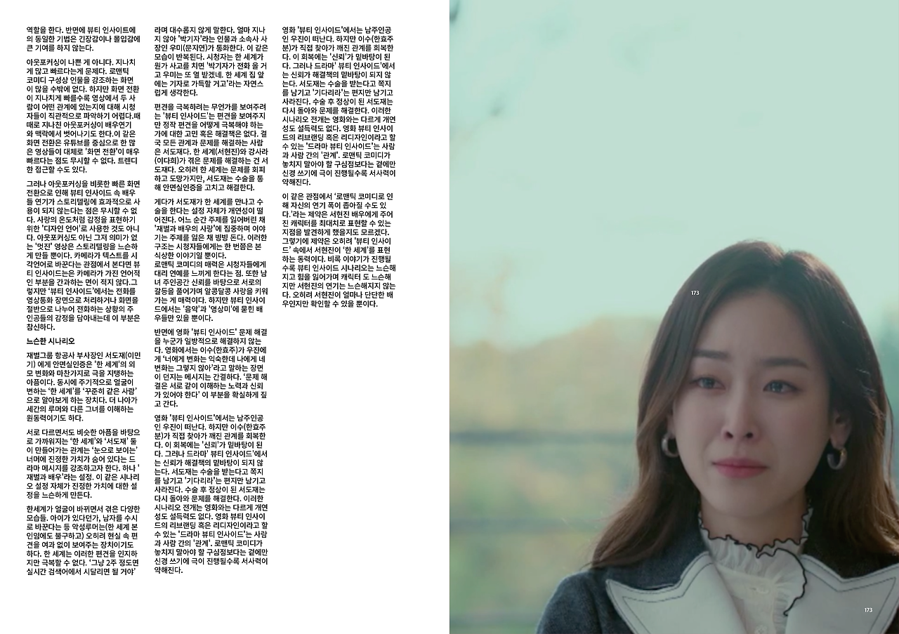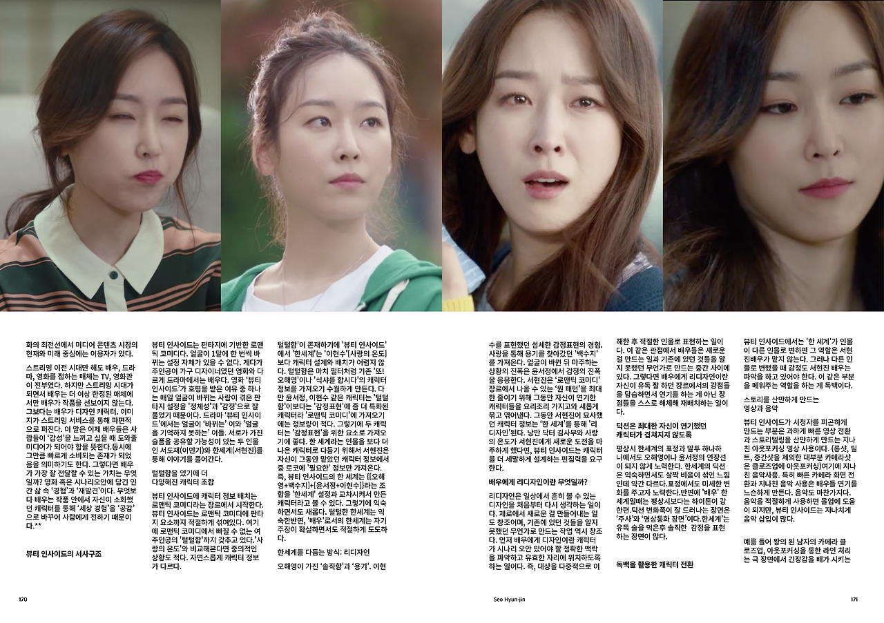 이 같은 관점에서 배우들은 새로운 걸 만드는 일과 기존에 있던 것들을 '예전에는 알지 못했던 새로운 무언가'로 만드는 중간 사이에 있다. 그렇다면 배우에게 리디자인이란 자신이 유독 잘하던 장르에서의'강점'들을 답습하면서 연기를 하는 게 아닌 장점들을 해체해 재배치하는 일이다. 재배치 후에는 캐릭터를 해석한 배우의 생각과 언어를 시청자의 시야에 맞추도록 조정한다.
