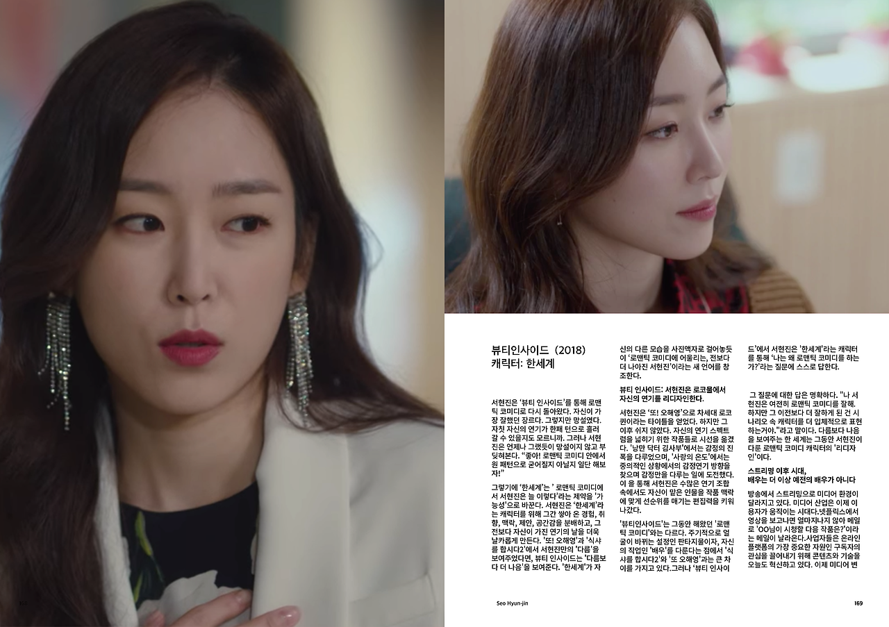 서현진은 ‘로맨틱 코미디’ 장르에서 나올 수 있는 ‘원 패턴’을 최대한 줄이기 위해 그동안 자신이 연기한 캐릭터들을 요리조리 가지고와 새롭게 묶고 엮어낸다. 자연스럽게 한세계안에는 그 안에는 그동안 다루었던 캐릭터들이 스며들어가 있다. 오해영이 가진 ‘솔직함’과 ‘용기’. 이현수를 표현했던 '섬세한 감정표현'의 경험. 사랑을 통해 용기를 찾아갔던 '백수지'의 성장을 가져온다. 얼굴이 바뀐 뒤 마주하는 상황의 진폭은 윤서정에서 겪은 '감정의 진폭'을 응용한다. 이처럼 그동안 서현진이 묘사했던 캐릭터 정보는 ‘한세계’를 통해 '리디자인'된다. 낭만 닥터 김사부와 사랑의 온도가 서현진에게 새로운 도전을 마주하게 했다면, 뷰티 인사이드는 캐릭터를 더 세밀하게 설계하는 편집력을 요구한다. 뷰티 인사이드에서 한세계는 얼굴이 주기적으로 바뀌는 여러 모습의 세계를 가지고 있지만, 한세계의 연기안에는 '서현진의 세계'가 있는 셈이다.